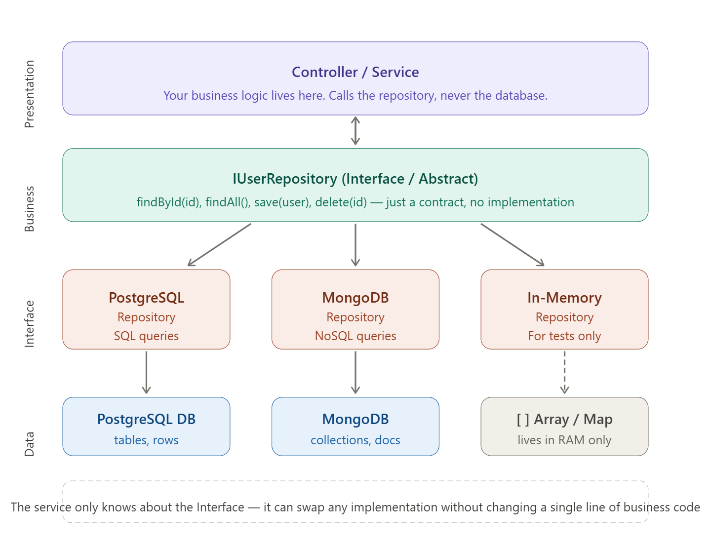 Your business logic never says “run this SQL query” or “call this API endpoint”. It just says “give me the user with ID 5” – and the repository figures out how to do that.